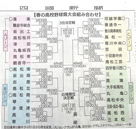 いつものことながら母校・高松商も、シード校の片隅にいるが、2回戦の対寒川戦(3/27)が第一鬼門、ここに勝って進めばシード1位の蓬莱と準決勝戦(4/4)まで行くだろう。四国大会出場順位決定戦は、4月11日(土)に行われ、四国大会(徳島)への順位が決まる。上位で進めば、他3県の2位チームと当り有利だとされている。しかしこの先の、全国大会はない。